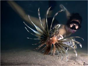 "Interaction" - At the end of a long snorcling uw photo session, this lionfish appeared in just 60 cm deep water. 1,5 hours of PS work on this pic since the entire scene was covered with dust & sand particles. I hope, that's the right category ;-)