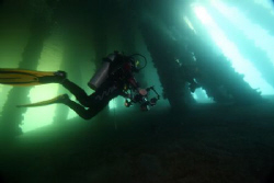 Under Dauin pier in Dumaguete. The water was a turbid but that gave the light a lovely "glow"