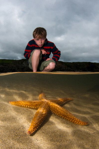 Common Starfish in a rock pool. Shot using a single strobe held above the water level to light both top and bottom-side subjects.