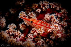 8mm no crop. Flathead Crocodilefish color up when they lay on plants and corals, on sand and rock they go to white and black. Finding one perched up high was a lucky treat. 5D Mark2 in Ikelite housing