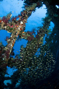 Shot from inside the wreck of the Carnatic with a school of Glass Fish. 10-17mm lens at widest setting.