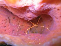 Arrow Crab in Sponge - on the hull of the Wreck of the Maj Gen Rogers USVI. Shot in macro mode at 4 inches - 50 ASA setting/Auto Shutter/Auto Flash with diffuser. Shot with Canon S500 on Nov 15, 2004.