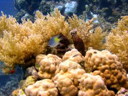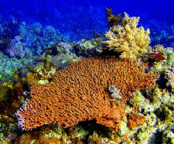 Table Coral at Saganeb South, Port Sudan. 30 feet depth, natural light only. The size of the red grouper in the upper right corner gives an indication on the siize of the coral. Canon Powerhot A70.
