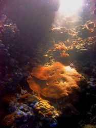 A ray of sun shines down a hole in the coral reef top, illuminating the coral growth beneath. Wingate reef, right outside the harbour of Port Sudan. Powershot A70 with manual adjustment of white balance.