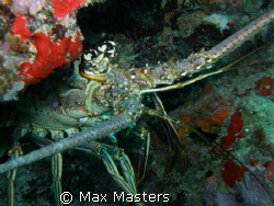This is a carribean spiny lobster peaking around a piece of coral.