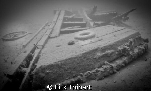 Wide angle close-up of one of the wheels on submerged locomotive at the former Empire Limestone Quarry, Sherkston, Ontario