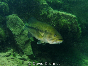 Curious Bass emerging form under a ledge in local quarry.