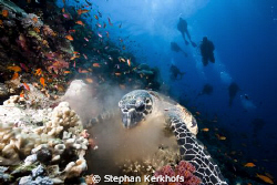 Hawksbill turtle and divers taken at Thomas reef Tiran.