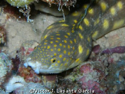 spotted eel in his hiding place in the top of the reef at black wall dive site in parguera wall........