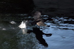 Bird takes fight! I did not realize birds use their feet to kick themselve out of the water.