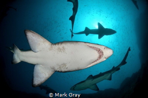 I think I counted 16 Grey Nurse shark and a Bull Ray in the shot. Taken inside the cave at Fish Rock