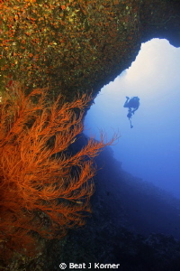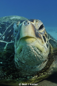 In a lava tube air bubble I surfaced to get a glimpse when a green turtle appeared right in front of me.