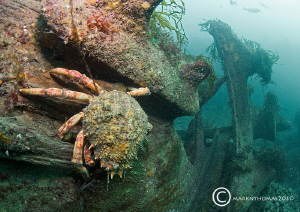 Spider crab on wreck of the liner Herefordshire, which went aground on Cardigan Island in 1934,