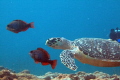 Hawksbill turtle swimming two Initial Phase Redband Parrotfish Big Coral Knoll off beach Fort Lauderdale. Lauderdale