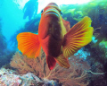 was trying get gorgonian properly exposed diver overhead while this Garibaldi constantly pecking my dome port finally he came center got shot. shot
