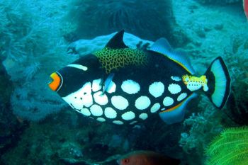 Philippines, Puerto Galera: a clown trigger fish; Nikon Coolpix 5000, Sea&Sea housing and strobe