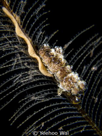 Doto sp. nudi laying eggs on a hydroid, and surronded by ...