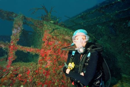 Pam on the Bibb wreck (laying on her side) 125' Nikonos 1...