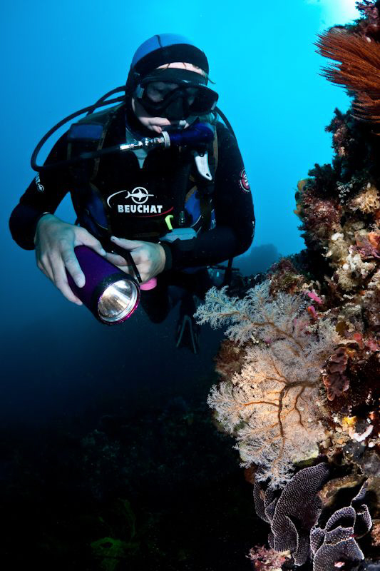 Dive Buddy lights up a soft coral at a dive site just sou...