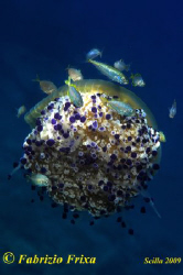 Fabrizio FrixaA small universe of life, a jellyfish "Cassiopeia" surrounded by many fellow travelers. Are small species of jacks.