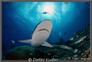 Vertigo is on the West Side of Yap Island. A wide shallow barrier reef drops at the breakers to about 5 meters and from there on it slops to about 15 meters to finally break into a wall. The reef has deep cuts, similar to rivers. The structures are stone corals. Vertigo is famous for it's sharks. Dominant are grey reef sharks and black-tip reef sharks. Occasionally we have hammerheads, sivertips and we had a tiger. Current on full/new moon, otherwise very calm. Extremely clear visibility 30+ meters. Very nice and exciting dive site for sharks. We offer shark feedings on the site and have up to 35 sharks at the time there - find more on our web site