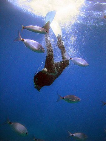 Rob Nixon free diving with the bream at Comino Caves, hav...