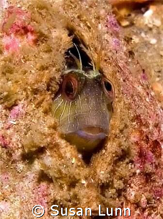 Crested Blenny with one eye on the bubble monster in fron...