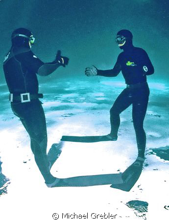Apnea divers greet each other under the ice at Morrison's...