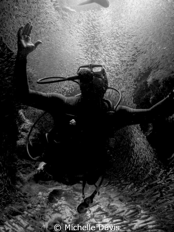 A diver in complete awe of the Silversides at Devil's Grotto
