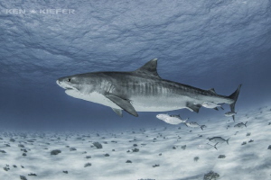 Tiger Shark named "Notch" cruising with an entourage of fish.