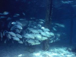 school of jacks under the sipadan jetty.taken while snorkelling.