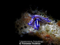 Hypselodoris tricolor, 1 cm. Light with optical zoom snoot. Nikon Coolpix P7000 with Subsee Lens +10