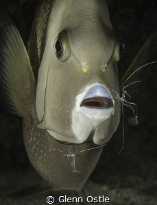 We were photographing a band of Pederson shrimp on a purple vase sponge when an Angel fish swam up and the shrimp got to work.