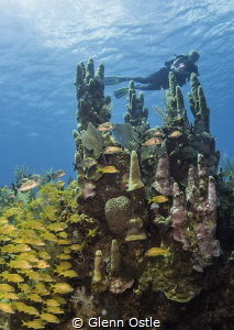 Diver over large pillar coral at Fish Tank in Grand Cayman's East End.
