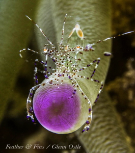 This tiny shrimp was clinging tightly to the end of a purple-tipped anemone during a strong current.