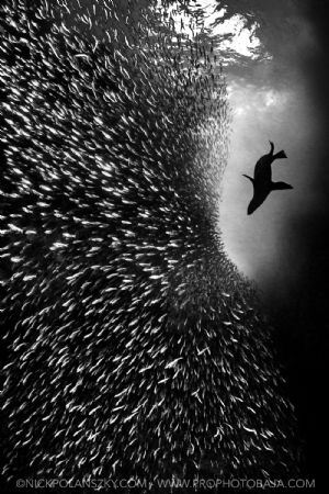A California Sea Lion swoops in trying to seperate a Sard...