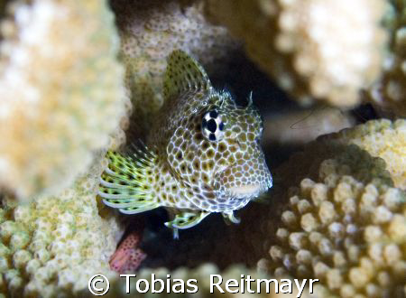 Shy leopard blenny hiding inside staghorn coral, Koh Bon,...
